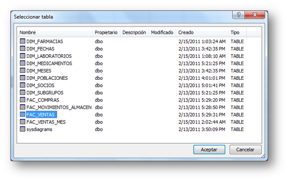 …tras coger la tabla de ventas (por decir algo), le doy a aceptar, y me pregunta donde quiero importar la información: